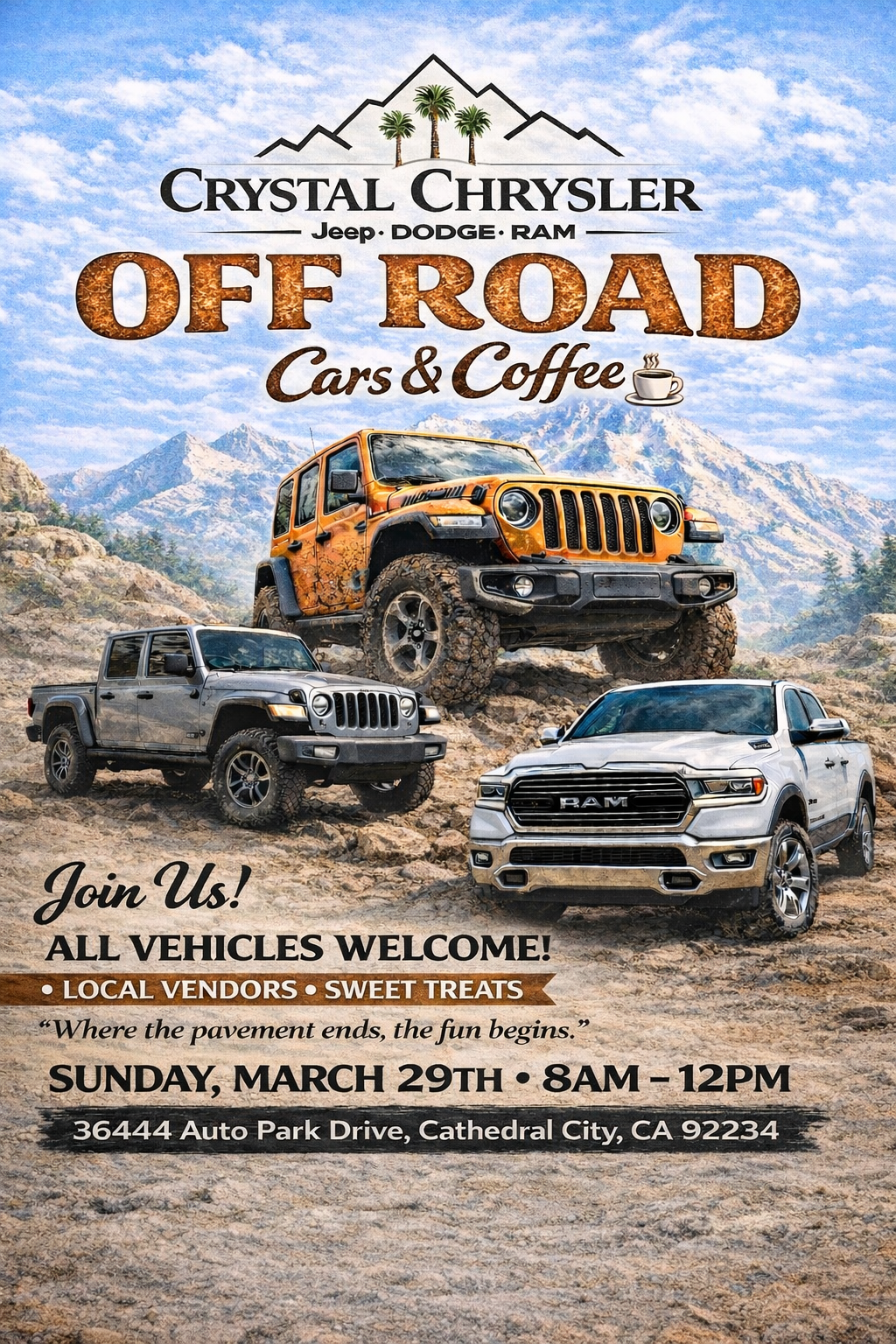 Crystal Chrysler (Jeep, Dodge, Ram) has invited Great Autos to their Off Road Cars & Coffee, BUT ALL VEHICLES ARE WELCOME.
